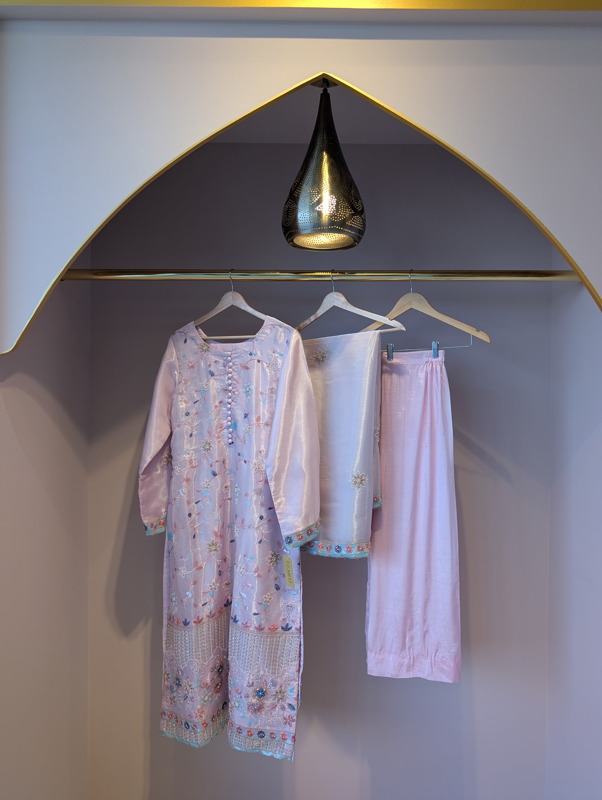 A subtle, light pink sating material with beaded zari work. Includes a matching dupatta and palazzo pants.