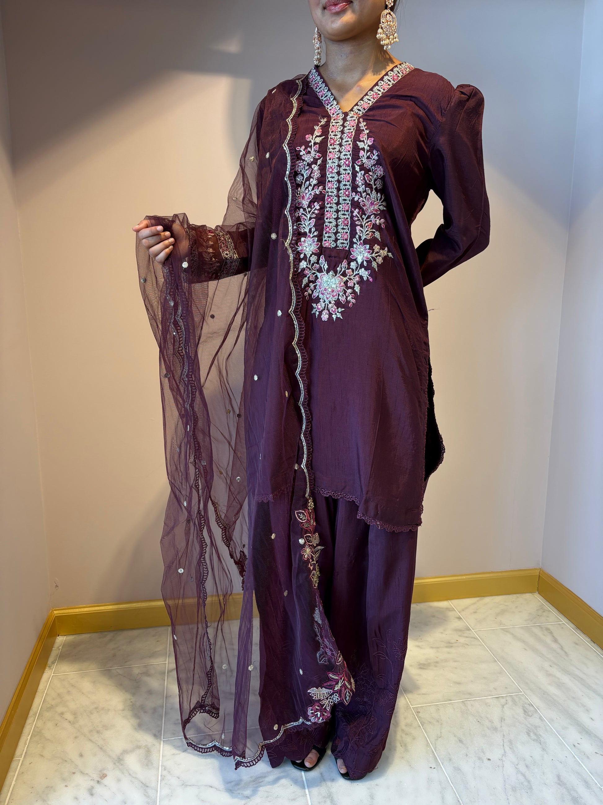 A stunning deep purple cotton shalwar kameez set. Includes a matching shalwar and dupatta.