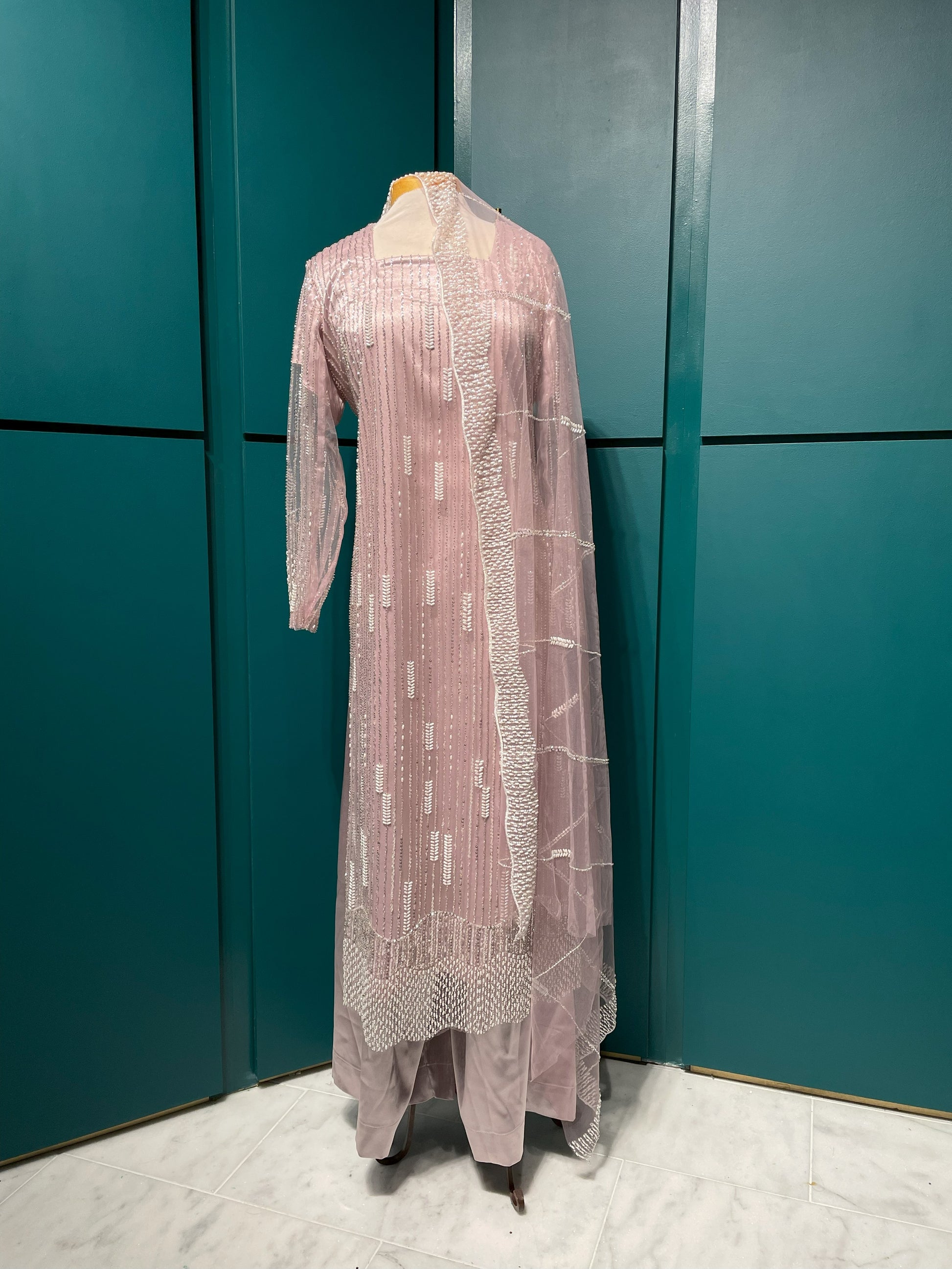 Light Pink Wedding Wear Kurti, with Dupatta and Palazzo Pants.