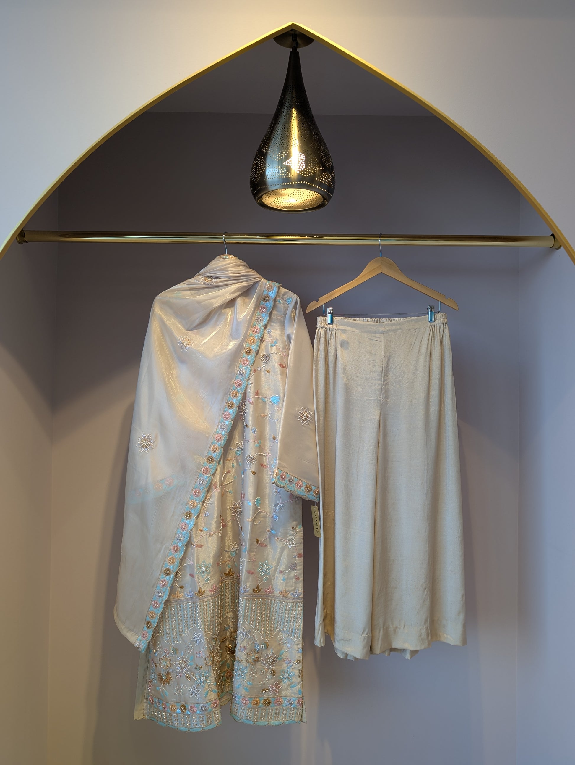 A beige satin material with beaded embroidery. Includes a stunning matching dupatta and palazzo pants.